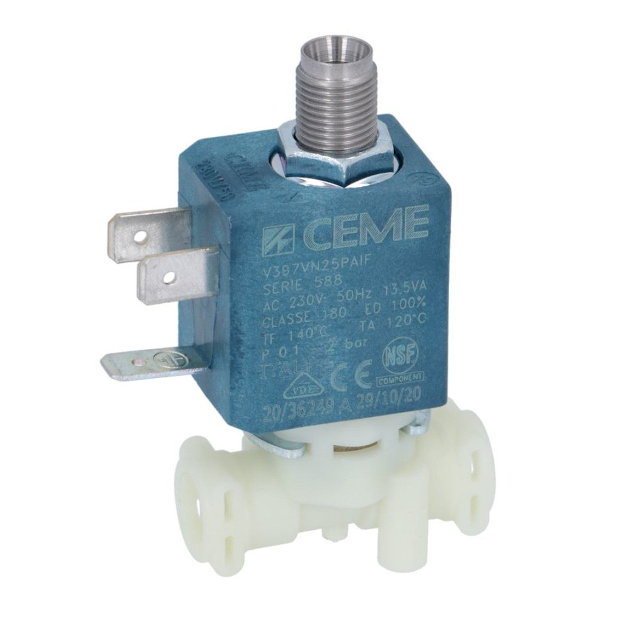 Original 3-vejs CEME V397 solenoidventil til styring af vand- og dampflow i Sage/Breville espressomaskiner. Ventilen afbryder og leder trykaflastningsvandet væk fra gruppehovedet efter bryg, så pucken forbliver tør, og maskinen er klar til næste shot.